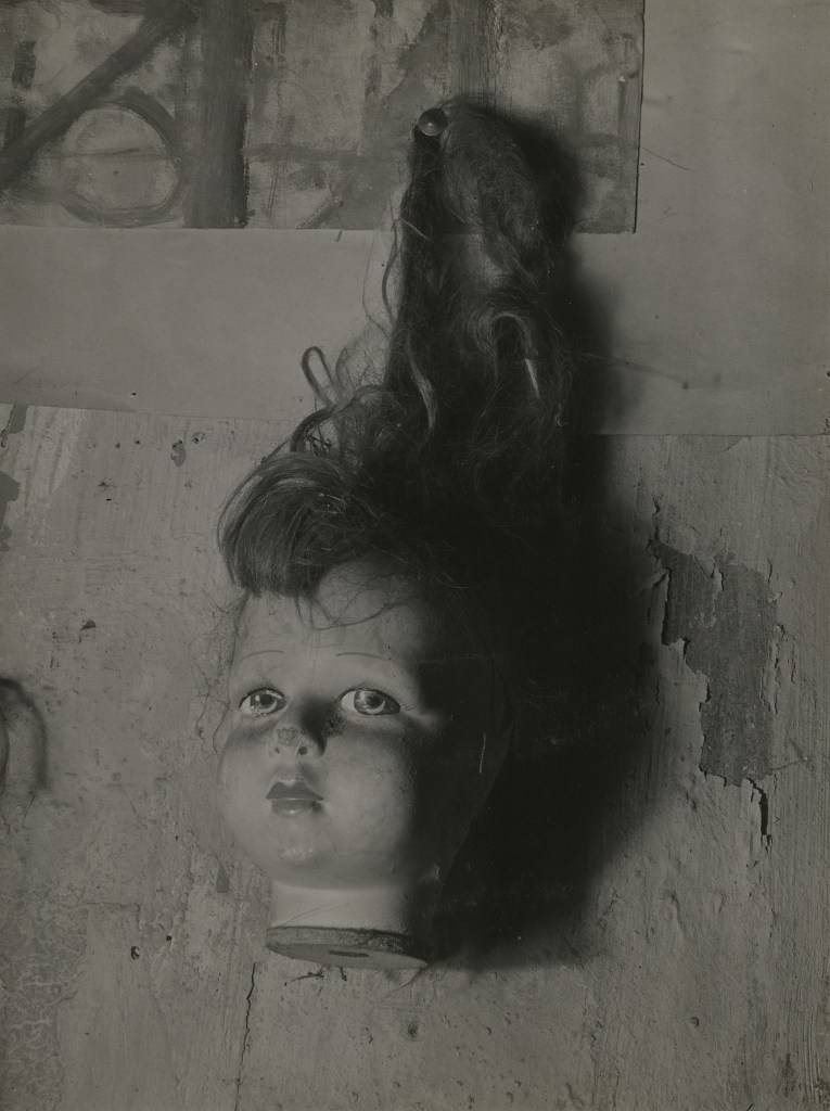 Pierre Jahan :: Untitled (Doll head hanging from nail – Atelier of the painter Henri Heraut), 1944. | src Gitterman Gallery