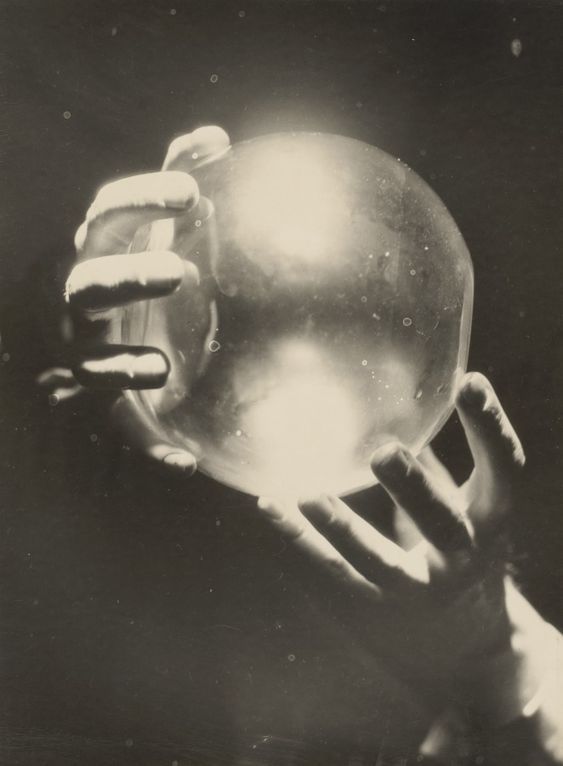 Roger Parry, a photographer who produced experimental images that related to both modernism and Surrealism, also had a commercial studio. He produced this image for a promotional campaign for André Maurois’s science fiction tale The Weigher of Souls (Le Peseur d’ames), in which a doctor’s experiments to find immortality reveal that life force is a gas that escapes the body at death. The photograph illustrates a sentence from the book about a ball that contained the spirits of two brothers captured in an invisible beam of light. | quoted from source