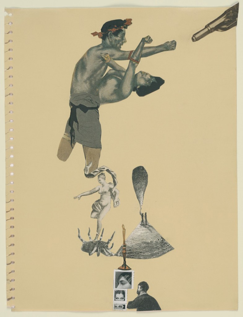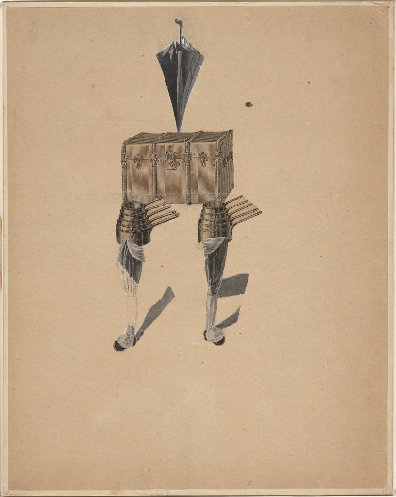 Cadavre Exquis [André Breton, Max Morise, Jeannette Ducrocq Tanguy, Pierre Naville, Benjamin Péret, Yves Tanguy, Jacques Prévert] :: Figure, 1928. Collaborative collage made stacking found printed images of mundane objects (*) in an anthropomorphic figure. | src MoMA (*) The presence of the umbrella recalls a phrase the Surrealists adopted from the poet Comte de Lautréamont (born Isidore Ducasse) as an ideal description of the principle of juxtaposition: “As beautiful as the chance encounter of a sewing machine and an umbrella on an operating table.” [quoted from source]