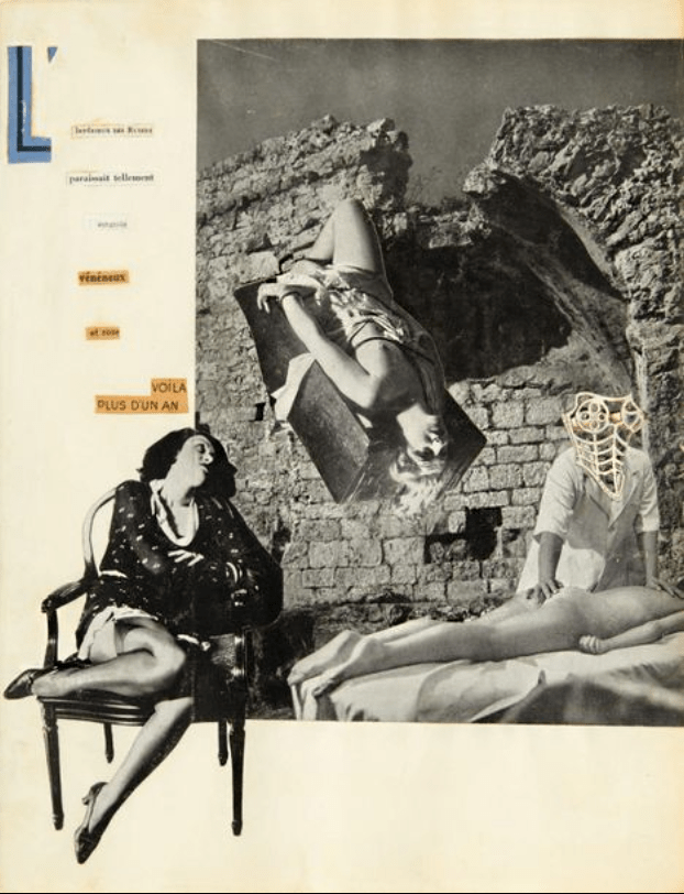 Georges Hugnet :: L’intérieur des ruines paraissait tellement déshabillé… Sans lieu ni date [1936]. Collage photographique original sur papier. Collage original: il a été reproduit dans La Septième face du dé (1936). Fameux livre illustré de vingt collages à pleine page. Expo: The Dada & Surrealist word image (1989), avec étiquette du Los Angeles County Museum. Exposition présentée ensuite au Wadsworth Antheneum et à la Schirnkunsthalle. Étiquette de l’exposition Le Poète en tant qu’artiste. | src Drouot