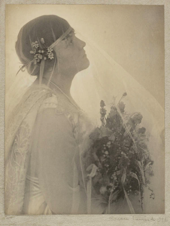 Portrait of a bride, 1921 The Parrish Sisters :: Portrait of a bride in silhouette pose, holding bouquet, veil covering face. Signed: Grace Parrish, 1921. | src Grace and Williamina Parrish Photograph Collection, SLPL