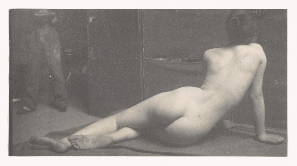 This small platinum study shows a rare glimpse of Thomas Eakins’ teaching studio. Posed on a low platform between Eakins, his camera, and a student sketching in the shadows, a nude model rests comfortably, the focus of all attention. In the 1880s and 1890s, Eakins integrated photography into his teaching of art, made photographic studies for his paintings, and also photographs intended as independent works of art. (Quoted from source) The Met