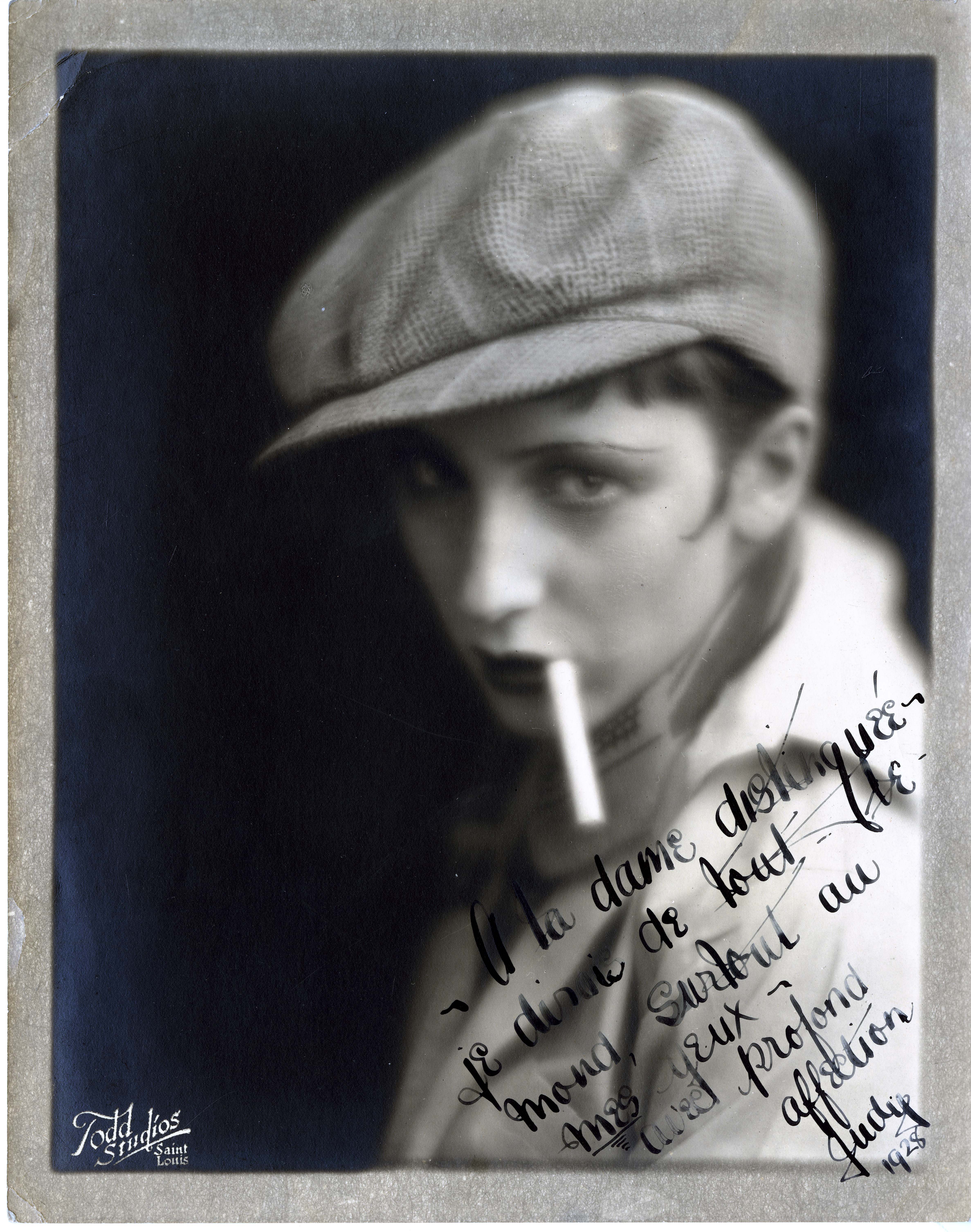 Todd Wilson Studios :: Black and white soft-focus shot of Judy Gilmore wearing a hat with a cigarette in her mouth. Signed with a handwritten note in French (dated 1928). 11.04.1905 | src Max and Gertrude Hoffmann Photograph Collection at ZSR Library