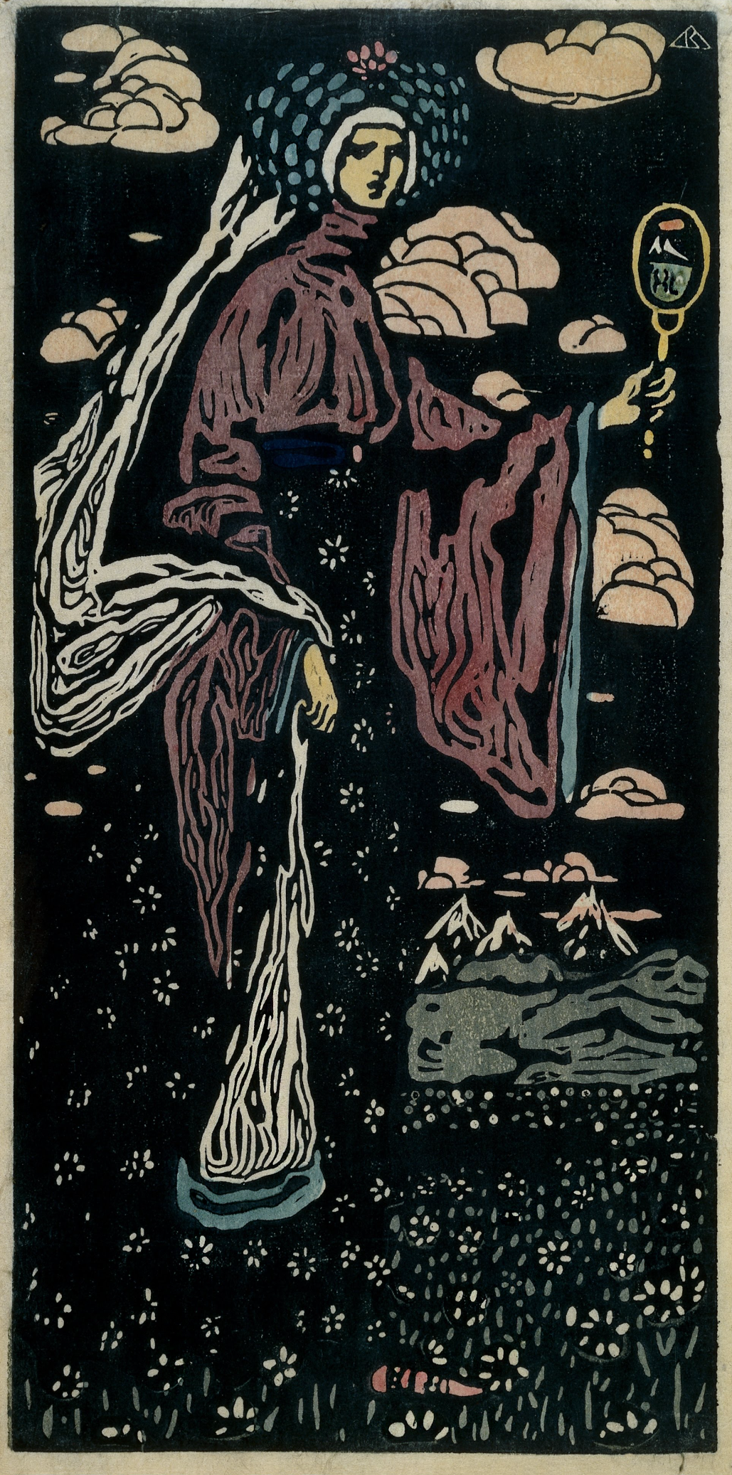 Vassily Kandinsky :: Der Spiegel. The mirror; draped female figure holding up hand-mirror, 1907. Colour linocut, printed in mauve-red, green, blue, yellow and black, on oriental paper. | src The British Museum | Bibliographic references Roethel 1970 / Kandinsky, das graphische Werk (49)