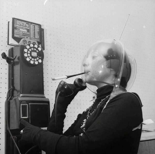 Weegee [Arthur Fellig] :: Girl from Mars (woman wearing a plastic globe ‘helmet’, like an alien or astronaut), on the telephone, Greenwich Village, NYC, ca. 1955. | originally posted on tumblr