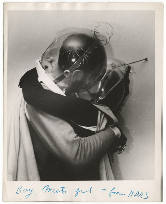 Weegee :: ‘Boy Meets Girl – from Mars’. Couple wearing plastic globes ‘helmets’, like aliens or astronauts, kissing, in Greenwich Village, NYC, ca. 1955. | originally posted on tumblr