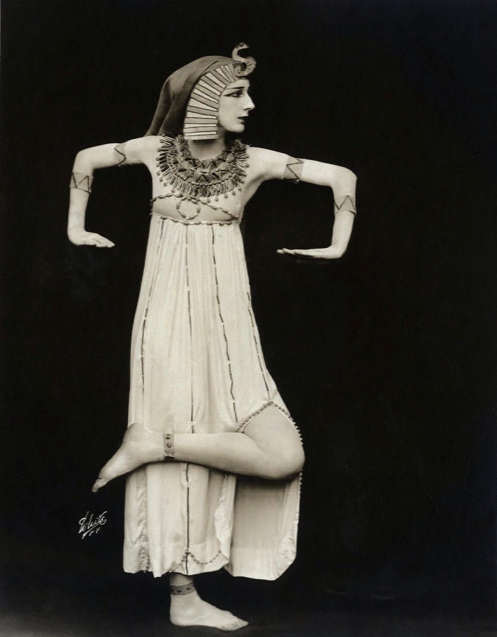 White Studio (NY) :: Portrait of ‘Russian’ dancer Désirée Lubowska [aka Mme Lubowska or Lubovska], full-length portrait, standing, right profile, in Cleopatra costume, 1915. (Désirée Lubovska was not actually Russian. It was the stage name of American born dancer Winniefred Foote). | src Les sources d’une île