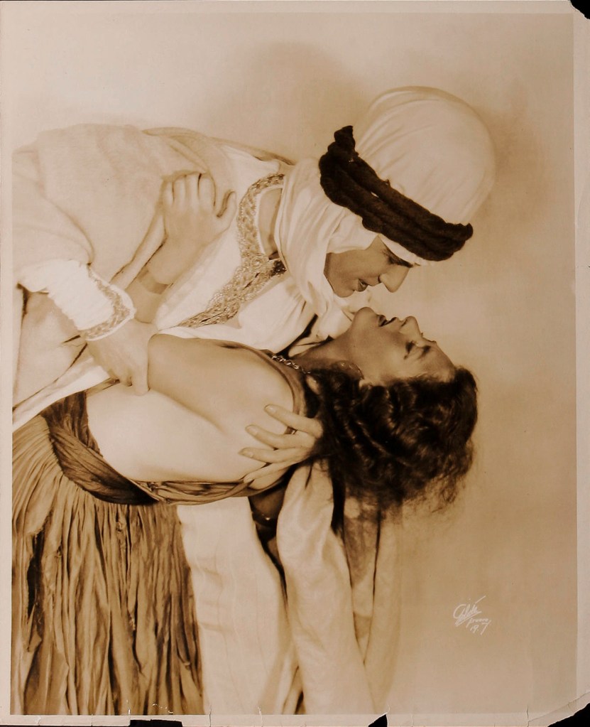 White Studio :: Bela Lugosi and Hortense Alden in Arabesque, 1925. Reverse displays photo credit ink stamp and a descriptive caption label: Hortense Alden (the Bedouin) and Bela Lugosi (the Sheik), whom she lures to his destruction in “Arabesque”, a modern comedy of manners at the National Theatre. | src Heritage Auctions