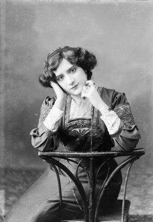Portrait of half-body of the actress Pura “Purita” Montoro Rodríguez sitting, resting her arms in the back of the chair, ca. 1910-1915 / src: Arxiu Nacional de Catalunya