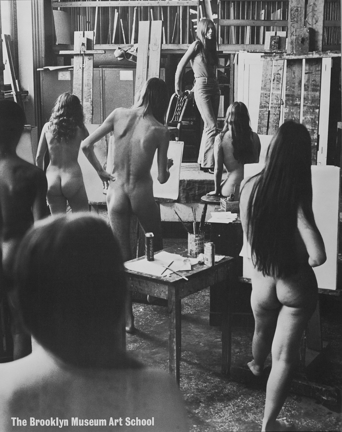Drawing from the live model has a long tradition not only in the history of art, but also the at the Museum. Dating back to 1841, BKM has provided hands-on art education by organizing drawing classes. A century later, Brooklyn Museum Art School opened as a non-degree professional school for artist. This advertising poster produced for the School in 1974 provided a humorous take on the dynamic between artists and models.