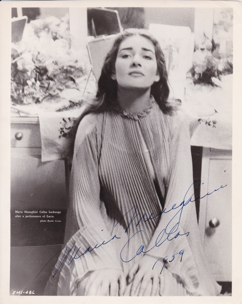 Maria Meneghini Callas backstage after a performance of Lucia. Photo: Paolo Costa. Autographed 1959. | src & thanks & link to original post on tumblr >>> Gnossienne