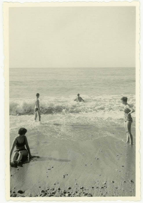 Three girls in swimming suits, two of them with rubber rings at the beach, 1950’s