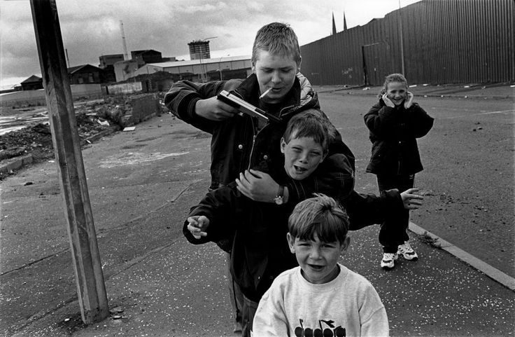 Abbas :: Kids play war with pellet gun under the “peace wall” which separates Protestant Shankill from Catholic Clonards districts, Belfast, UK, 1997