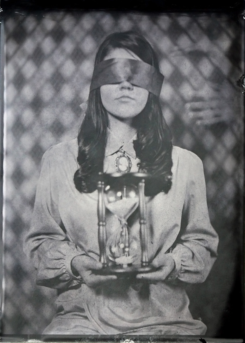 1920′s photograph of blindfolded woman standing in front of covered xylophone / src: Etsy