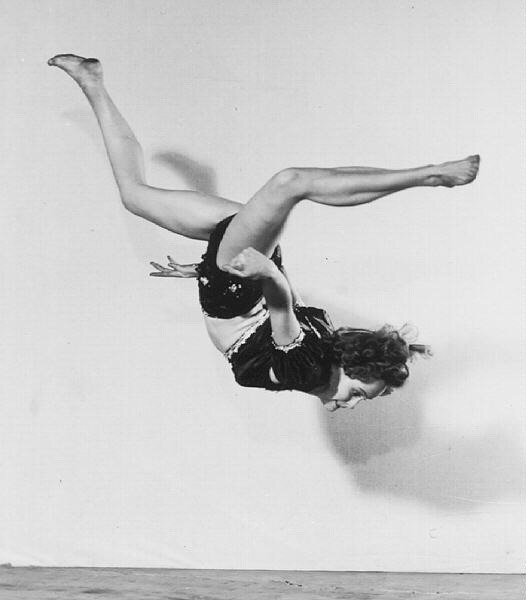 Bonnie Nebelong, known for her routines – ballet type dances with contortion and tumbling, ca. 1940’s #suspended #midair