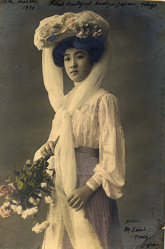 Japanese woman in western dress. Colorised postcard. Japan, 1906 | src taishou-kun