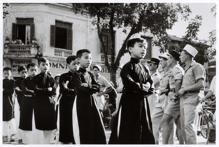Boys singing and marching as soldiers look on, Hanoi, Vietnam. May 23, 1954 / src: Magnum Photos