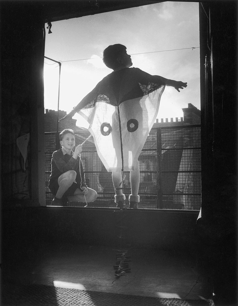 Willy Ronis :: Let’s go fly a kite [original]. Children playing on a window, pretending to be a kite, unplaced, undated / via