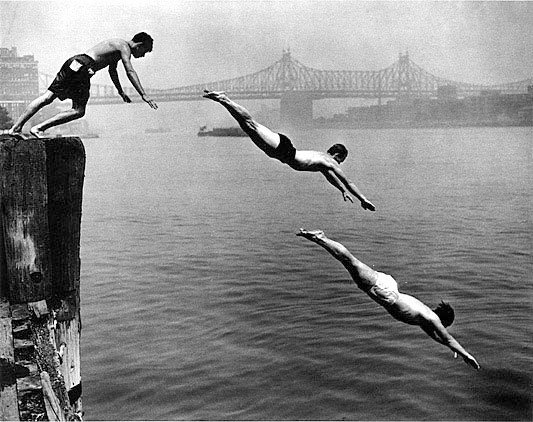 View of the Statue of Liberty and the Manhattan and Brooklyn Bridges with a tugboat moving a barge, NYC, 1996 / src: Magnum Photos