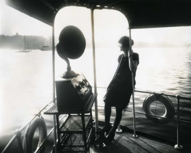 Woman dressed as flapper listening to music in a boat, unknown place, undated, probably 1920′s / src: Expresso Buzz via peoples river history