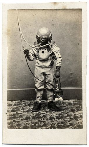 individual wearing a Morse Diving Helmet and an insulated suit stands in