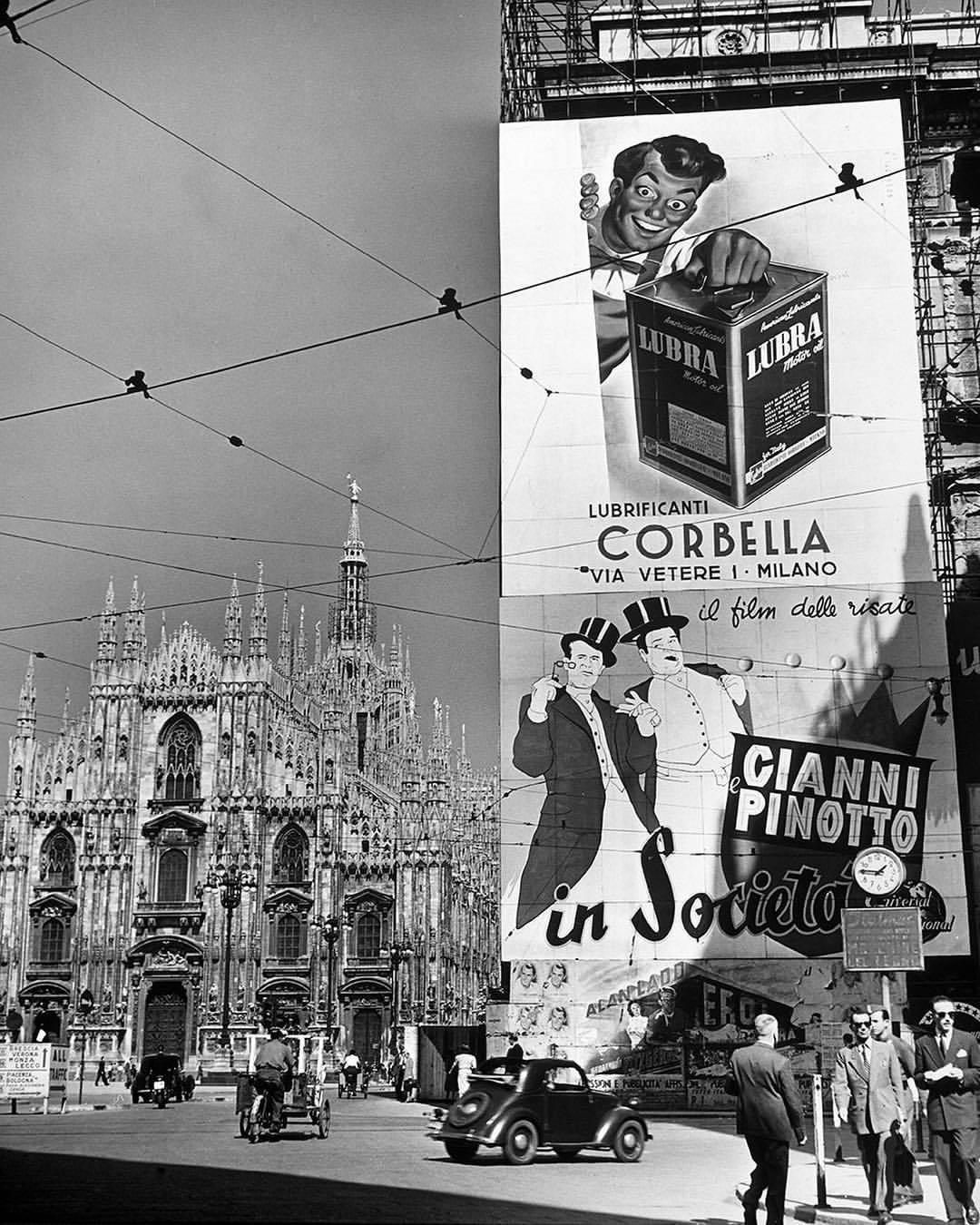 Alfred Eisenstaedt :: This image ran with the following caption: “Garish advertising signs are faithful copies of US huckstering. These signs partially obscuring Milan Cathedral, advertise a motor oil (top) and two U.S. movies. Middle one feature Abbott and Costello, whom Italians call Cianni e Pinotto. Posters like this emphasize commercial activity of Milan, which is the shopping center of Italy.”