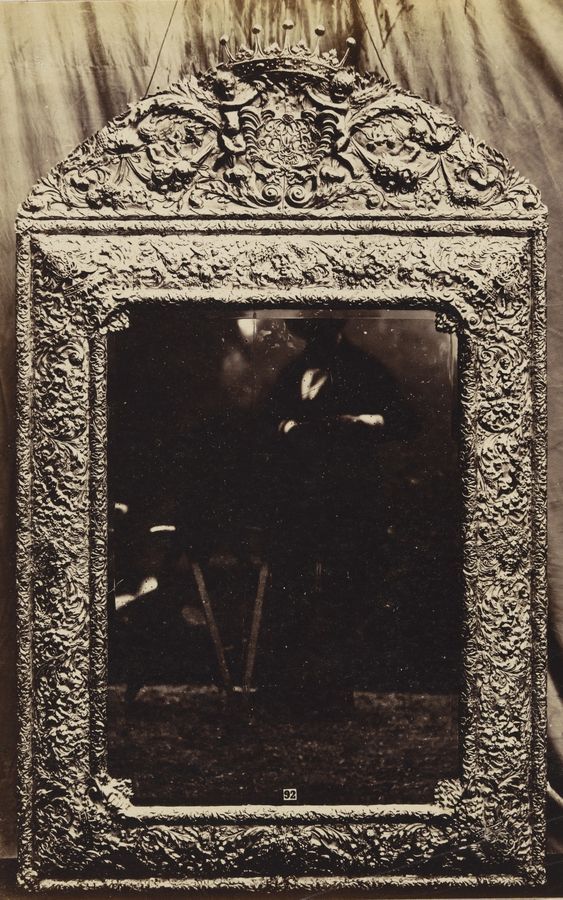 Charles Thurston Thompson was the first official photographer employed by the South Kensington Museum. He was officially appointed in 1856 but photographed at the Museum starting in 1853. Objects were photographed prior to their return to lenders so that photographic copies could be sold to designers, craftsmen and students, and also filed in the Museum’s library for study. Thompson included his camera, reflected in the mirror. [src Luminous Lint]