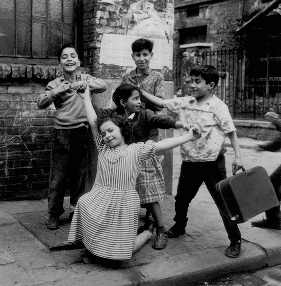 Shirley Baker :: Two children are playing with a pair of Second World War surplus gas masks while one is still in his school blazer, Manchester, Great Britain, 1960′s / source: Daily Mail
