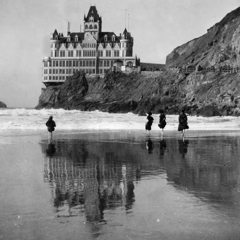 Edward “Doc” Rogers :: The Cliff House, San Francisco, CA, early 1900′s – Ladies wade at the beach with their long