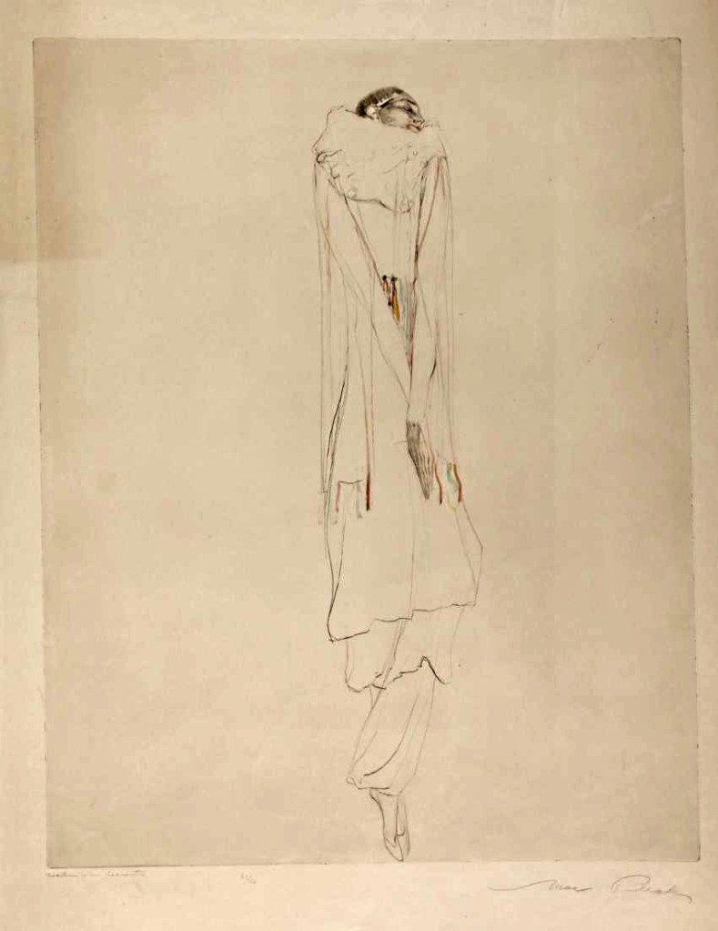 Max Pollak :: Joachim von Seewitz (Joachim Wilhelm Friedrich Carl Oscar von Brüsewitz). Depiction of the dancer as Pierrot with a long robe hanging from his body, color etching, around 1920. | src Auktionhaus Mehlis