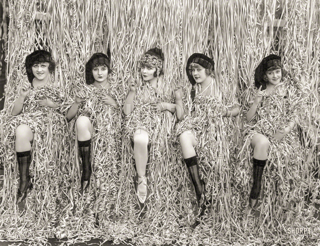 Nelson Evans :: Five Mack Sennett girls provocatively posed amid serpentine confetti. Winners of the Shoscar for Best Costume. Photo by Evans, L.A. April 1918 | source and hi-res: Shorpy