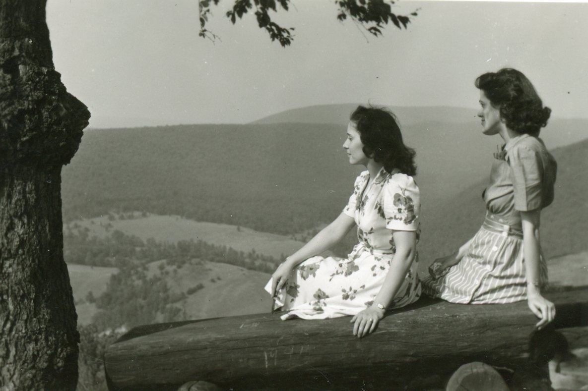 Women enjoy the view from a bench atop a mountain, vintage snapshot | src: House of Mirth on eBay