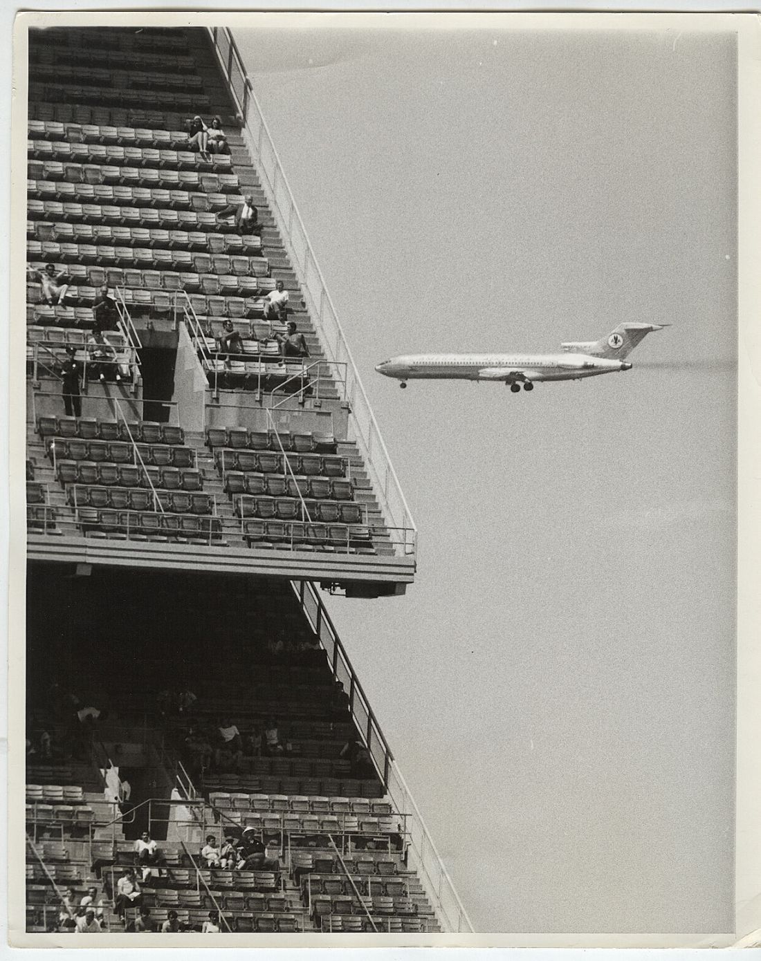 Visual Trickery. Flushing, NY: Headed on a crash course? – No, the just just appears to be aimed toward the left field stands at She stadium. It actually is flying far beyond the stands on its way to La Guardia airport. The optical illusion was created by the cameraman’s 135mm lens. UPI Photo 7/2/69 (written on verso) / source: VTG