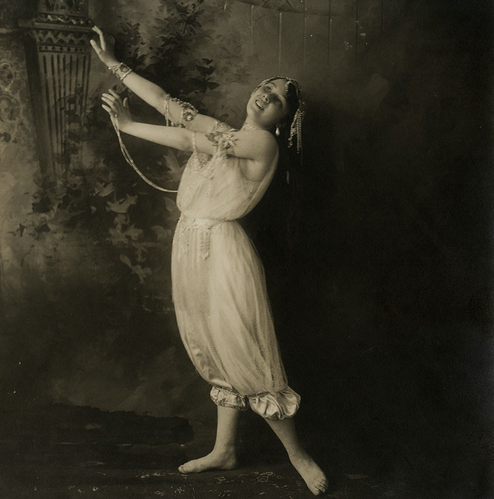 Theatrical dancer Parepa Osterman. A whimsical and enchanting art nouveau portrait of the dancer who is listed on verso as being a “toe dancer" and a barefoot dancer. Silver gelatin photograph, ca. 1910′s / via