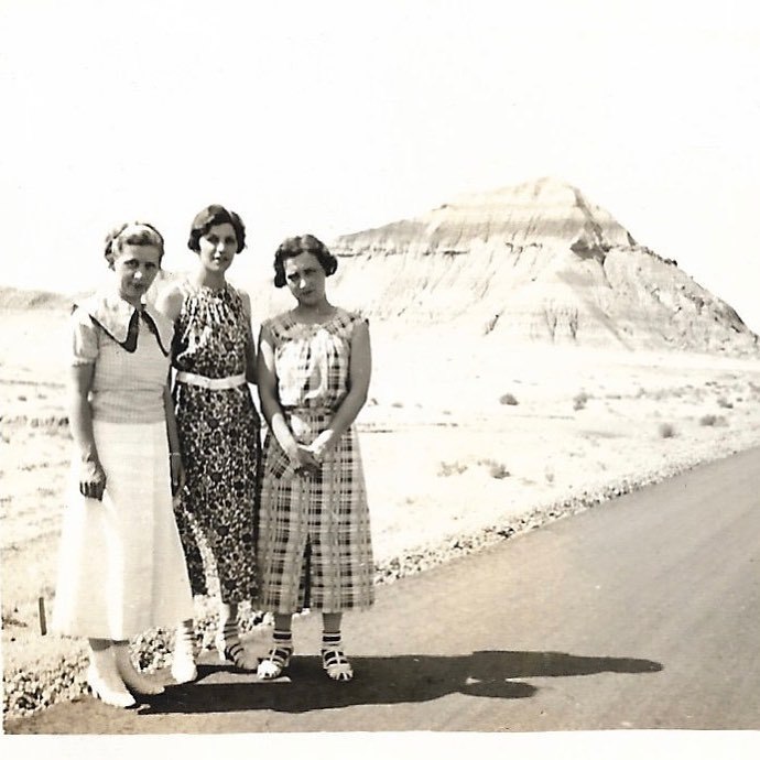 Three women on the left side of the road, Arizona Petrified Forest. Vintage snapshot. / src: sunshinevintagephoto