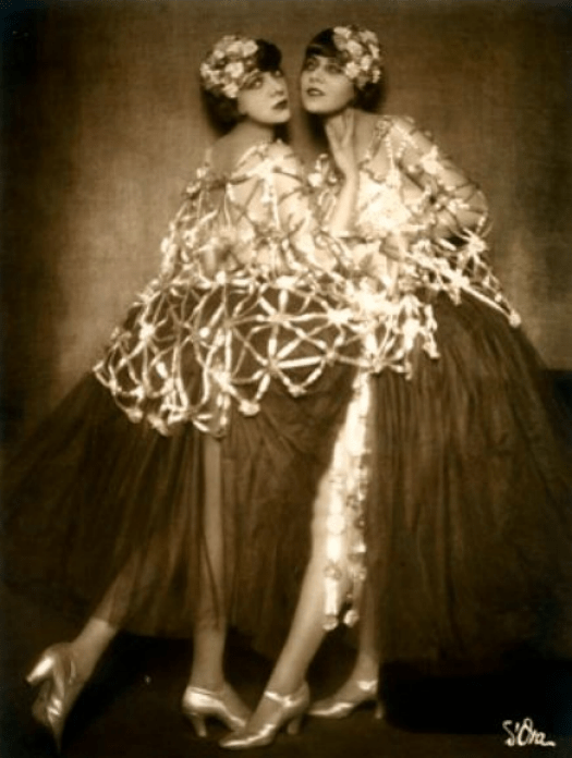 Vintage ca. late 1910′s / early 1920′s photograph of Ziegfeld Follies showgirls the Fairbanks Twins, Madeline and Marion, in a spirited jazz age costume view. Though not actually twins, the sisters were a fixture in vaudeville, early silent film, and become featured stars in the Ziegfeld Follies and Midnight Frolic revues. (by Culver Pictures Inc., NY) / src: Grapefruit Moon Gallery