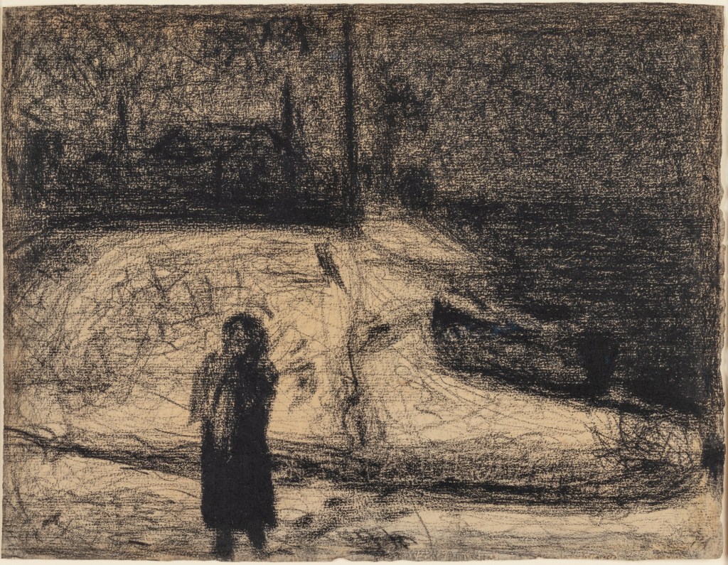 Georges Seurat :: The Zone (Outside the City Walls), 1882–83. Black ‘Conté’ crayon on cream laid paper. Seurat created the majority of his drawings with a greasy, medium-hard black crayon called Conté on thick Michallet paper with a pronounced texture. | src Chicago Art Institute