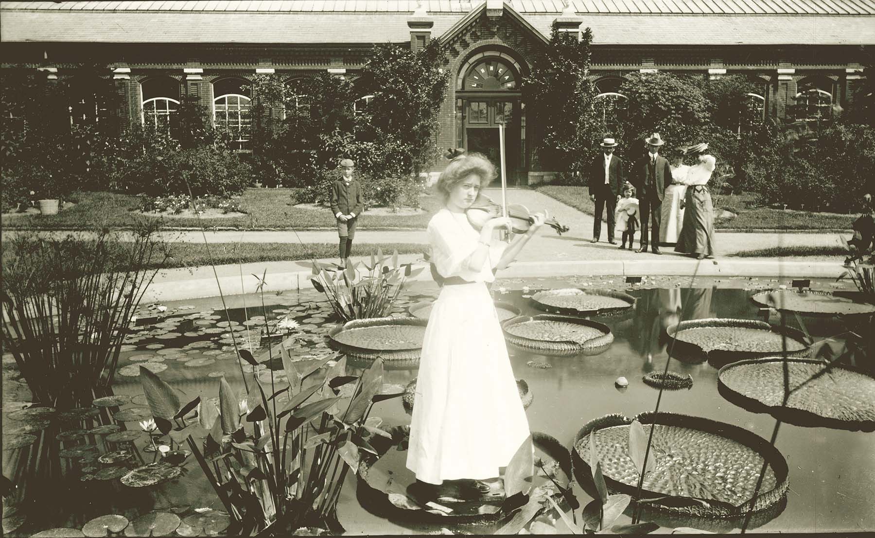 Woman playing violin, standing on lily pad at Shaw’s Garden (Missouri Botanical Garden), in front of Linnean House. Photograph by William G. Swekosky, ca. 1905. [Detail]A young woman playing the violin, standing on lily pad at Shaw’s Garden (Missouri Botanical Garden), in front of Linnean House. Photograph by William G. Swekosky, ca. 1905. | Missouri History Museum