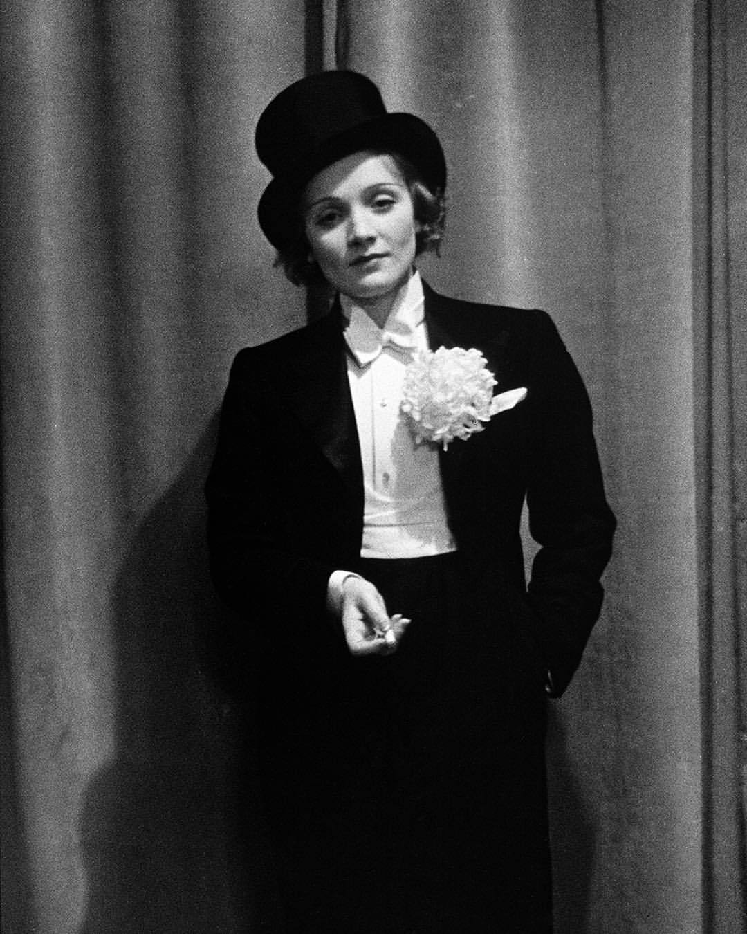 Alfred Eisenstaedt :: Marlene Dietrich wearing tuxedo, top hat and holding a cigarette at a ball for the foreign press in 1929. Evoking her role as Mademoiselle Amy Jolly, a cabaret singer, in ‘Morocco’, directed by
