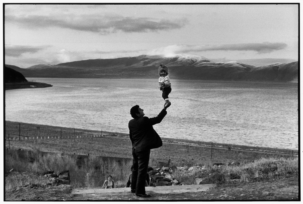 French aerialist Philippe Petit holds a balancing pole as he crosses a steel cable suspended between the not-yet-completed Twin Towers of the World Trade Center, 1350ft above ground, New York City, 7 August 1974 [AP]