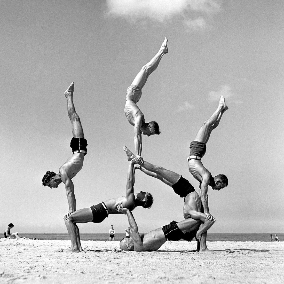 George Caddy :: ‘Beachobatics’. The Graham gymnasts doing a six-man ground pyramid (from left to right, top row) Wal Balmus, Frank Cottier and Max Stewart hand-balance off Vic Whitehead and Jack Goldberg (face obscured), all supported by bearer Alf Stanbrough, Bondi Beach, Australia, 1936