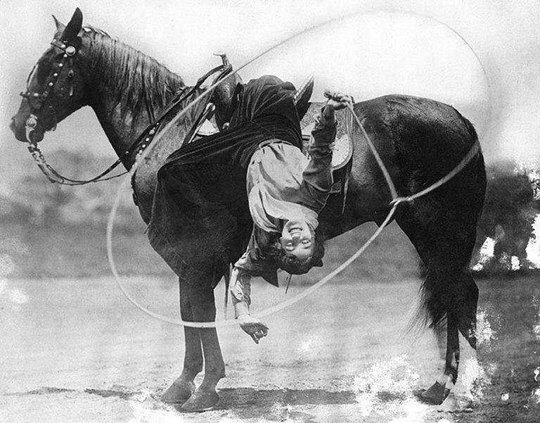 Flores La Due performing fancy rope trick at the Calgary Exhibition and Stampede, ca.1912 / source: Twitter