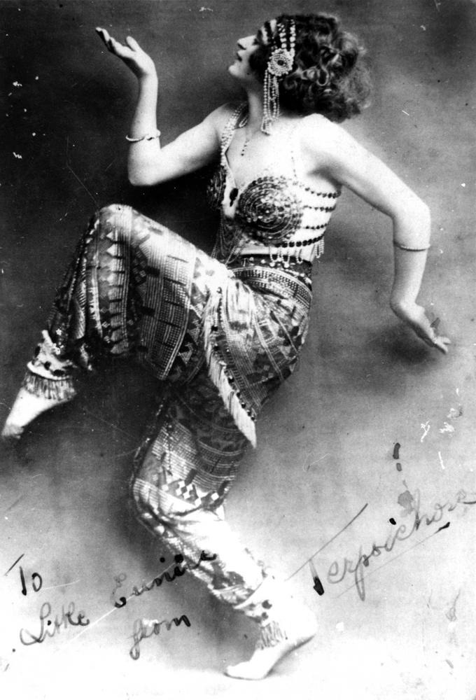 The image shows an exotic dancer ‘Terpoichore:’ performing at the Tivoli Theatre. The inscription reads: “To Little Eunice, from Terpoichore”