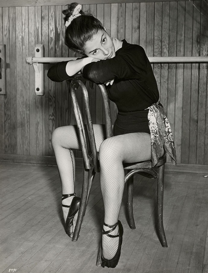 Pier Angeli in a leotard, fishnet stockings, and ballet shoes seated backwards on a chair and looking up at the camera while resting her head in her arms, 1953. Press snipe reads: “TIME OUT… Pier Angeli takes time out to rest between trapeze stunts during rehearsals for her aerialist role in MGM’s charming ‘Equilibrium’, one of the ‘Three Love Stories’. Ricardo Montalban co-stars with Miss Angeli in this sequence, directed by Gottfried Reinhardt. Sidney Franklin is producing.”