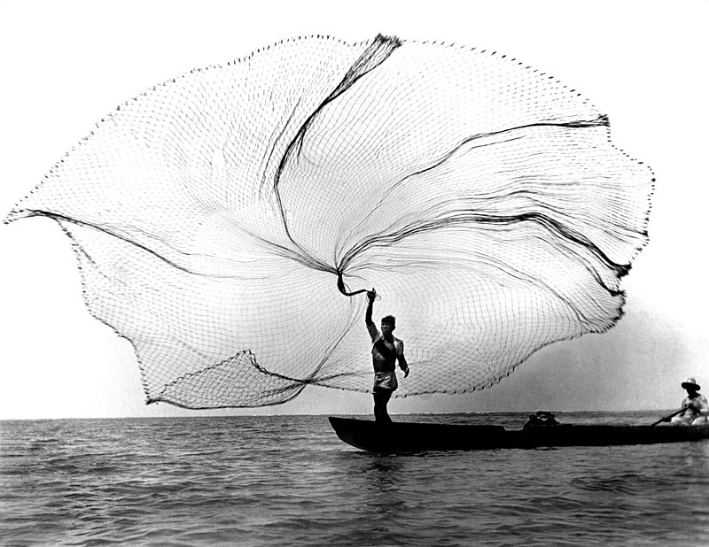Girl with sunglasses crawls into a fishing net (1950’s). Photographer unknown. / src: servatius.blogspot.com