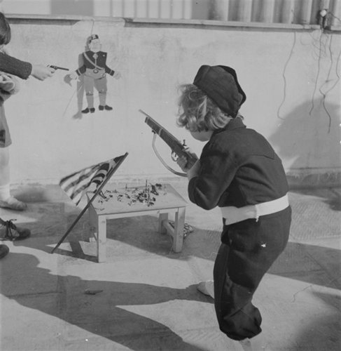 Child wearing a National Youth Organization (EON) uniform, points at the wooden figure of Mussolini, Athens, Greece, 1940