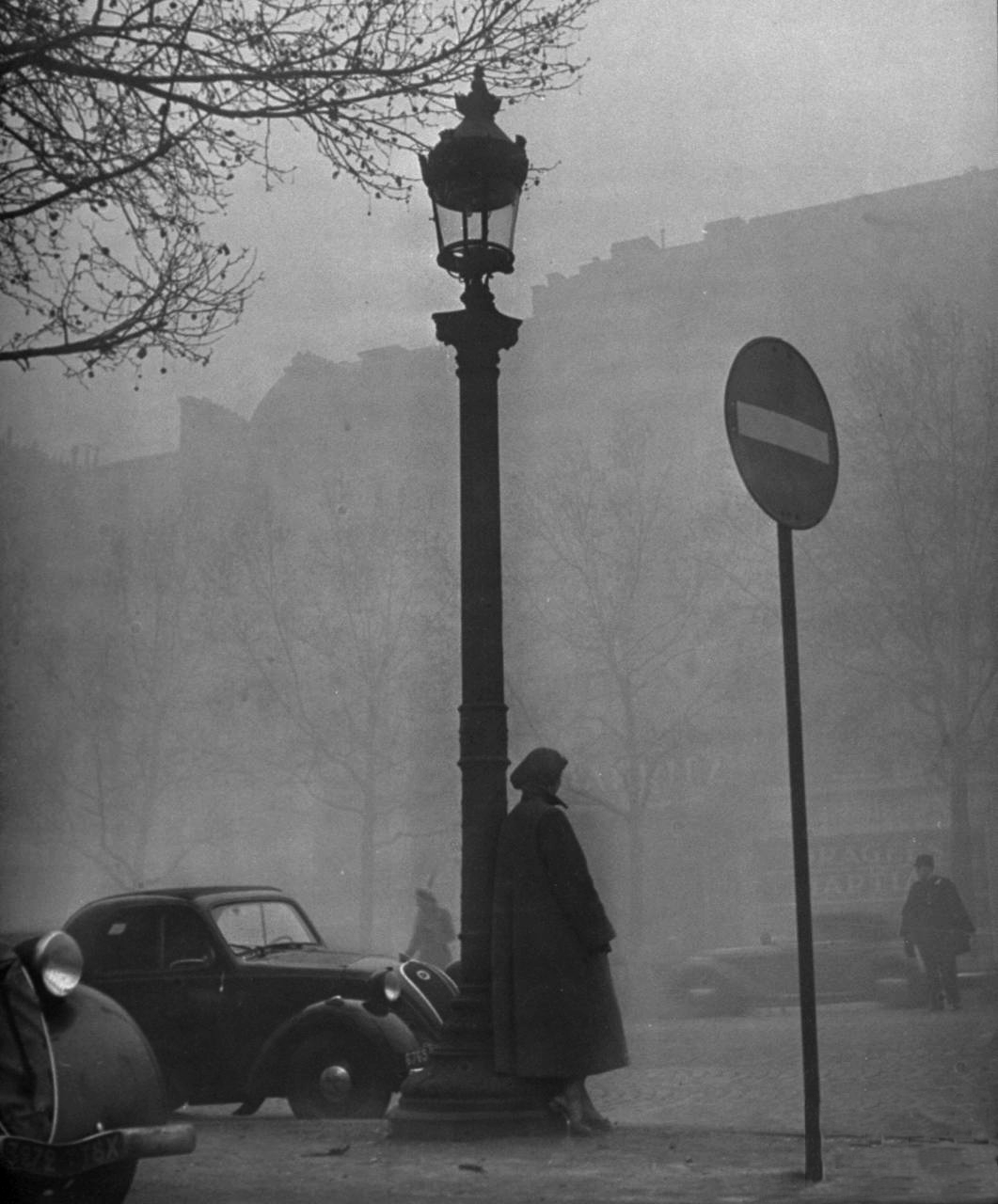 Yale Joel :: People and vehicles moving about city shrouded in fog, Paris, 1948 / via