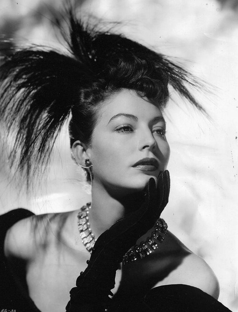 Susan Abraham in a John Cavanagh evening dress with lace and matching gloves, Spring 1957 / via