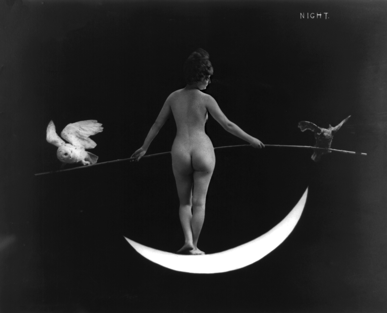 Night goddess nude, standing on crescent moon with a pole, balanced by an owl and night hawk, ca.1895