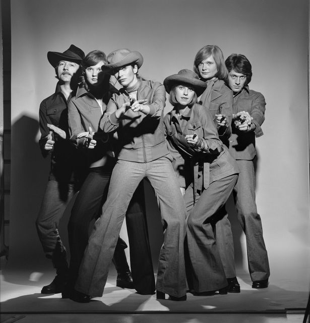 Roswitha Heikkilä’s Fashion Show “The Gang”. Models amongst others: Yrjö Tähtelä (left), Roswitha Heikkilä (centre), Raija Kiviharju and Pirkka Pekuri (right), Helsinki, Finland, 1974. Collection JOKA Journalistic Picture Archive. / src: Museoviraston kuvakokoelmat